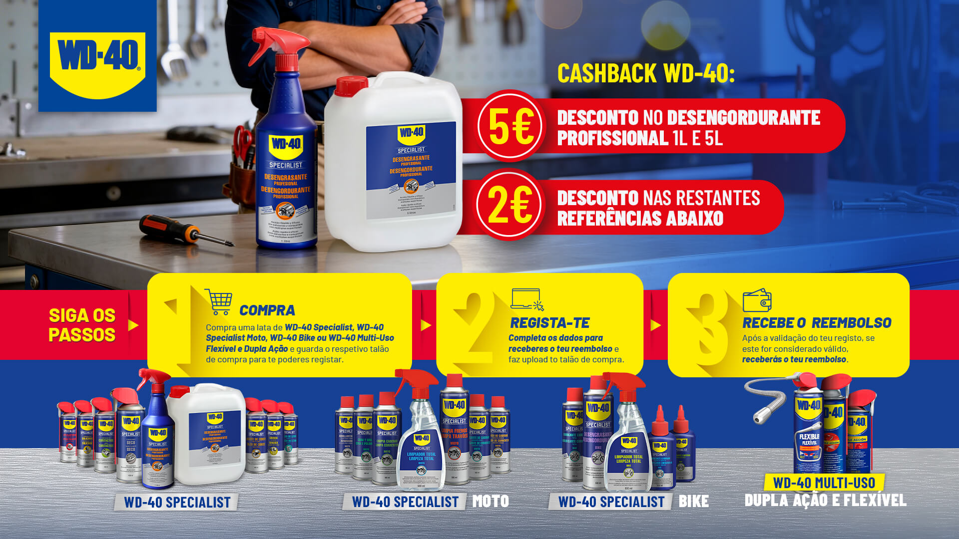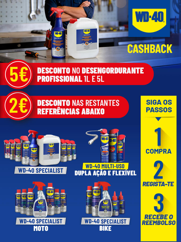 Compra uma lata de WD-40 Specialist, WD-40 Specialist Moto, WD-40 Bike ou WD-40 Multi-Uso Flexível e Dupla Ação e guarda o respetivo talão de compra para te poderes registar.